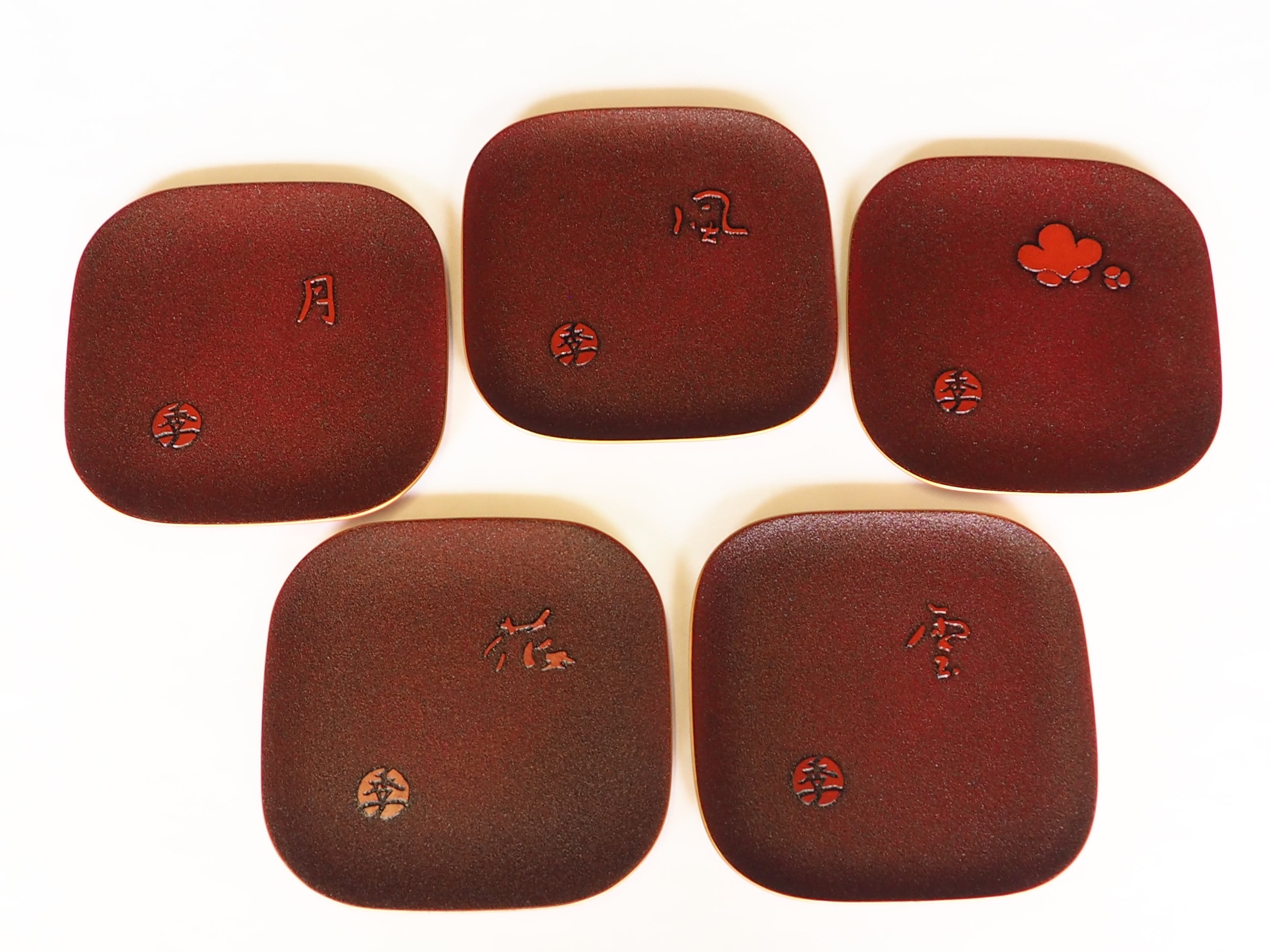 1組限定の隅丸模様変り銘々皿5枚組です。土佐古代塗で塗られた各皿は、一つ一つ模様が違い、隅が丸い四角い形状が特徴です。美しい仕上がりと個性的なデザインは、おしゃれな食卓を演出します。
