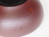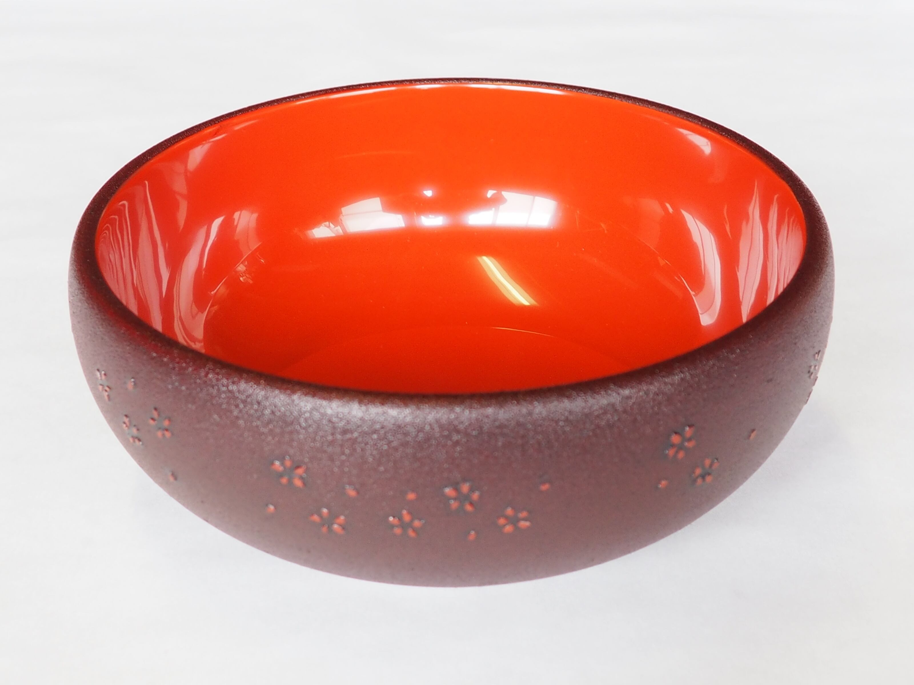 内面は朱色の色漆で塗り上げ、側面を土佐古代塗独特の「ザラ地」仕様で、ぐるっと花びらを配しています。
